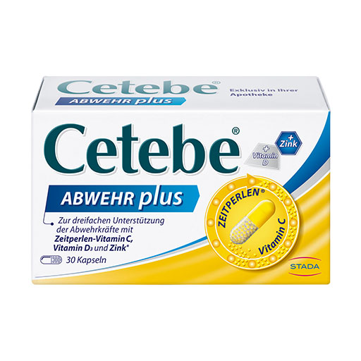 Nahrungsergänzungsmittel mit Vitamin C, Zink und Vitamin D3. Cetebe® ABWEHR plus unterstützt mit Hilfe der wichtigen Nährstoffe Vitamin C, Vitamin D und Zink die Abwehrkräfte und trägt zu einer normalen Funktion des Immunsystems bei.** Vitamin C, Vitamin D und Zink sind an unterschiedlichen Prozessen im Immunsystem beteiligt.