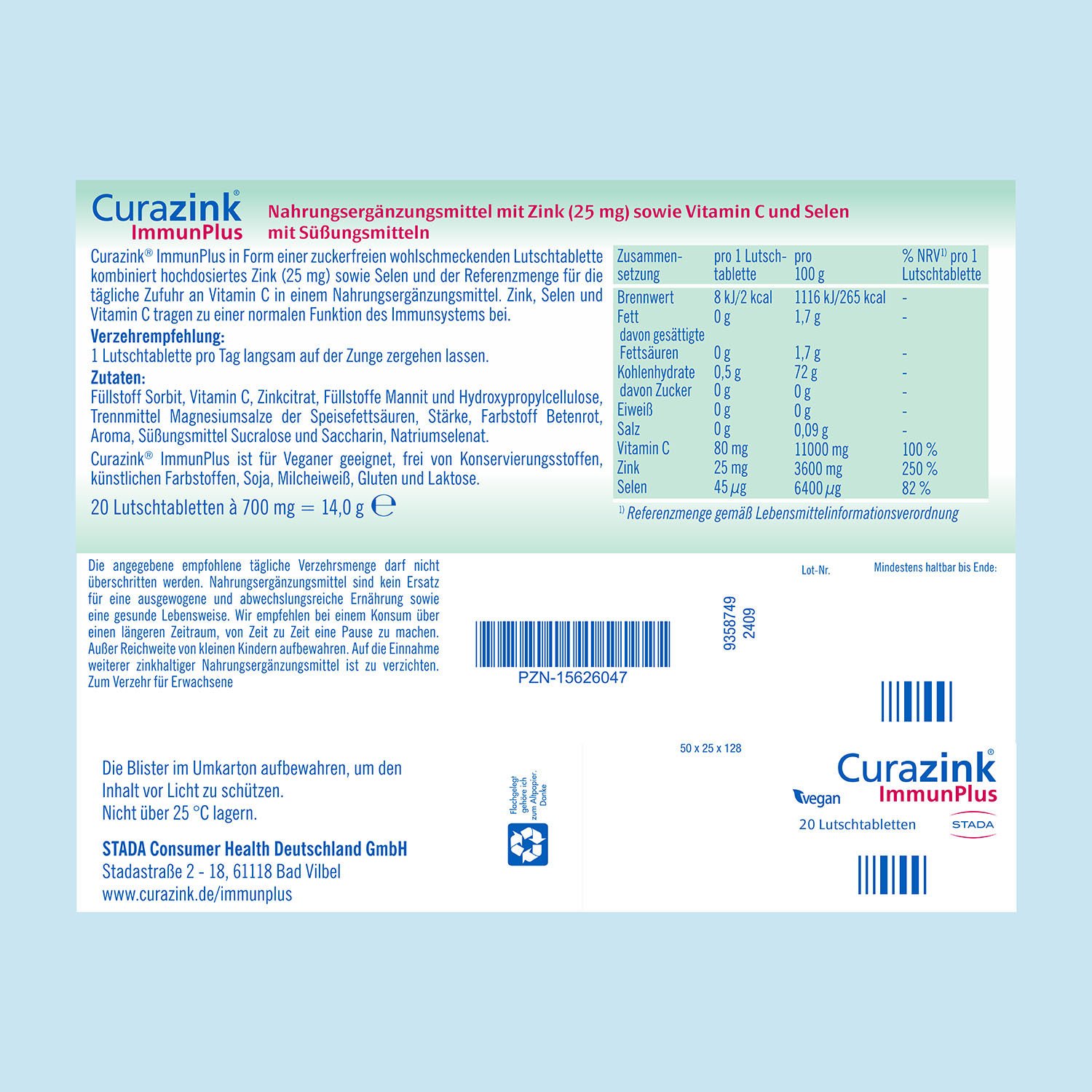 Die essenziellen Spurenelemente Zink, Selen und Vitamin C spielen unter anderem für die normale Funktion des Immunsystems eine wichtige Rolle. Curazink® ImmunPlus kombiniert in einer leicht einzunehmenden, fruchtig-frisch schmeckenden Lutschtablette hochdosiertes Zink (25 mg) mit Selen und der empfohlenen Tagesdosierung an Vitamin C. So leistet Curazink® ImmunPlus einen wertvollen Beitrag zur Ergänzung Ihrer täglichen Ernährung und zur Unterstützung der normalen Funktion ihres Immunsystems.