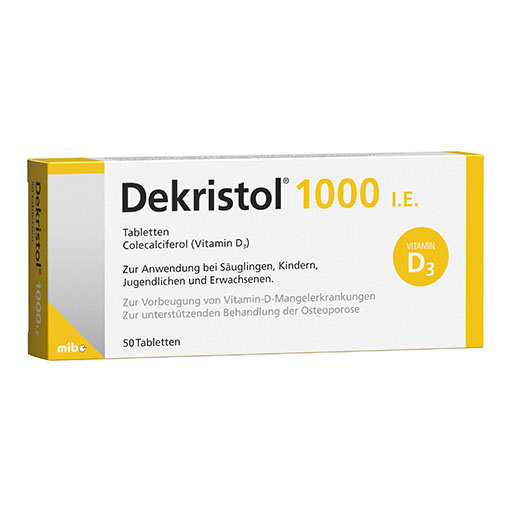 Dekristol® 1000 I.E. Wirkstoff: Colecalciferol (Vitamin D3). Anwendungsgebiete: Zur Vorbeugung gegen Rachitis und Osteomalazie bzw. bei erkennbarem Risiko einer Vitamin-D-Mangelerkrankung bei Kindern, Jugendlichen und Erwachsenen und zur unterstützenden Behandlung der Osteoporose bei Erwachsenen. Warnhinweis: Enthält Lactose und Sucrose.