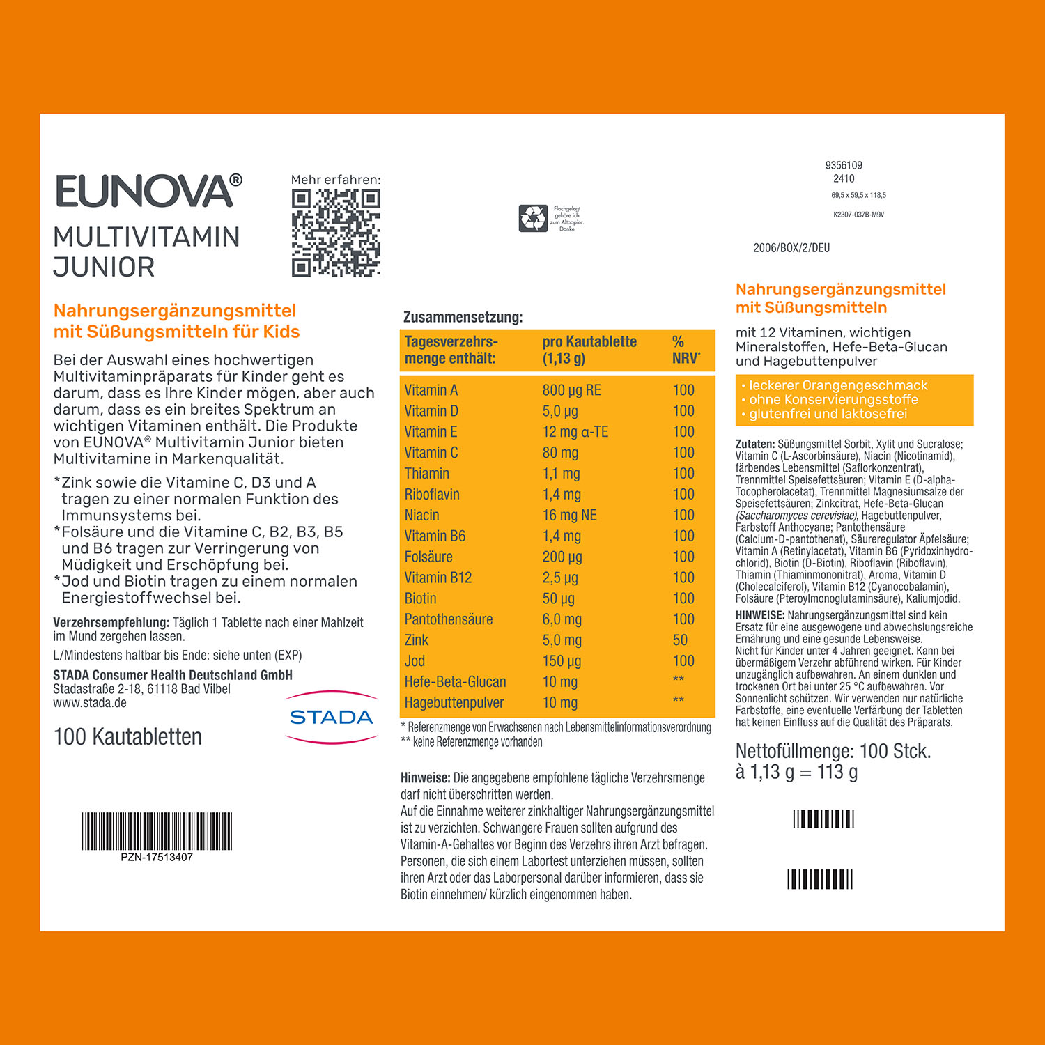 EUNOVA® Junior Kautabletten versorgen Kinder ab 4 Jahren mit 12 Vitaminen und wichtigen Mineralstoffen. Die lecker nach Orange schmeckenden Kautabletten sind frei von künstlichen Farb- und Konservierungsstoffen.