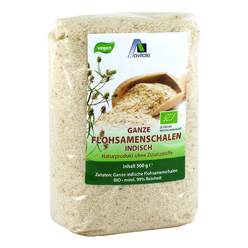 Ganze indische Flohsamenschalen aus kontrolliert biologischem Anbau (kbA), mindestens 99% Reinheit. Reich an Ballaststoffen: 65 g pro 100 g Flohsamenschalen.