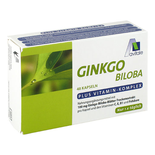 Nahrungsergänzungsmittel mit 100 mg Ginkgo Biloba Trockenextrakt und den Vitaminen C, E, B1 und Folsäure.