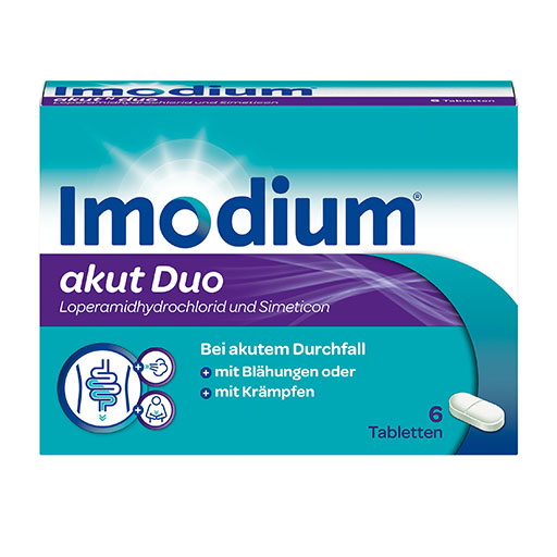 Imodium® akut Duo Tabletten. Mit Duo Wirkung: Lindert neben akutem Durchfall auch Krämpfe und Blähungen. Gut verträglich.