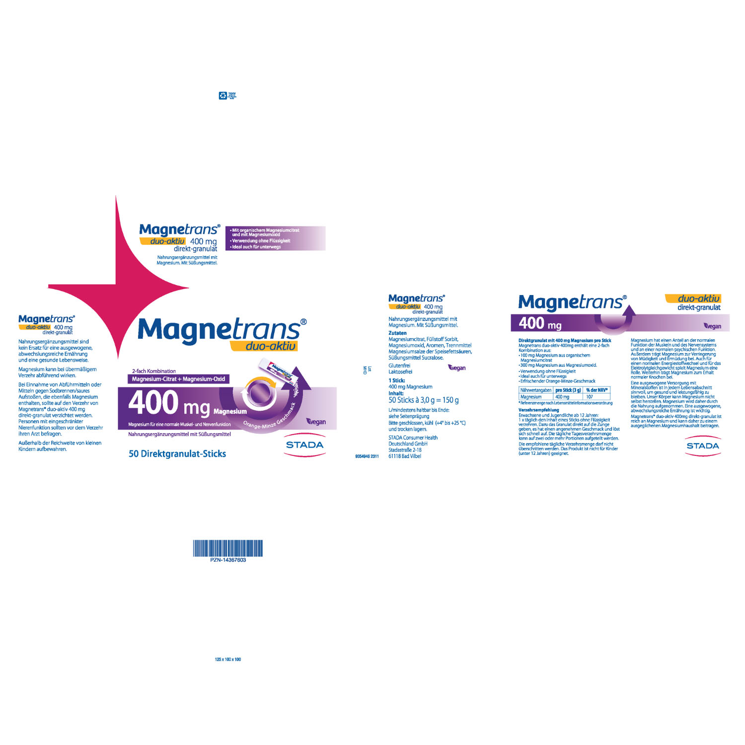 Ideal für unterwegs: Magnetrans® duo-aktiv Direktgranulat liefert 400 mg Magnesium pro Stick. Überall und leicht zu schlucken als 2-fach Kombination aus: 100mg Magnesium aus organischem Magnesiumcitrat und 300 mg Magnesium aus Magnesiumoxid.