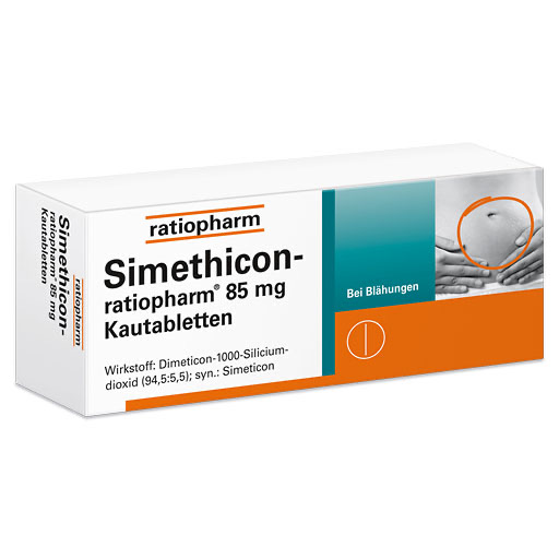 Simethicon-ratiopharm® 85 mg Kautabletten Wirkstoff: Dimeticon-1000-Siliciumdioxid Anwendungsgebiete: Zur symptomatischen Behandlung gasbedingter Magen-Darm-Beschwerden, z.B. Meteorismus. Als Hilfsmittel zur Diagnostik im Bauchbereich, wie z.B. Röntgen und Sonographie. Warnhinweis: Enthält Lactose und Sorbitol.