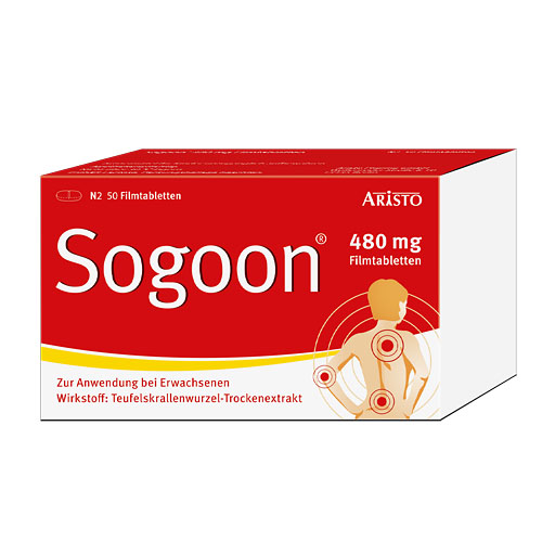 Bei Arzneimittel Sogoon® Filmtabletten handelt es sich um ein pflanzliches Antirheumatikum. Die rezeptfreien Filmtabletten sind zugelassen zur unterstützenden Therapie bei Verschleißerscheinungen des Bewegungsapparates. Sie hemmen Entzündungen und können die Schmerzen bei Gelenkverschleiß lindern. Eine Filmtablette enthält 480 Milligramm Trockenextrakt aus der Teufelskrallenwurzel. Wichtig: Die Wirkung der Tabletten tritt nicht sofort ein. Doch nach wenigen Tagen regelmäßiger Einnahme können Sogoon® Filmtabletten die Beschwerden spürbar lindern.