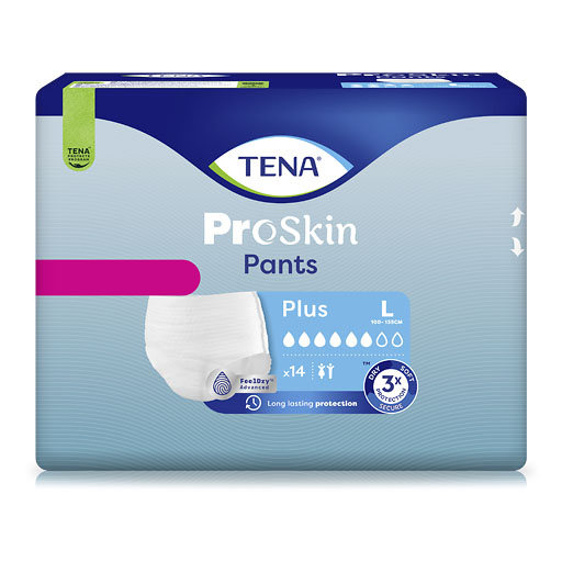 TENA® ProSkin Pants Plus sind für Männer und Frauen geeignet und in verschiedenen Größen erhältlich. Größe L ist passend für einen Hüftumfang von 100 cm bis 135 cm.