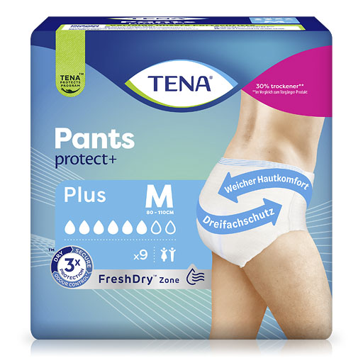 TENA® ProSkin Pants Plus sind für Männer und Frauen geeignet und in verschiedenen Größen erhältlich. Größe M ist passend für einen Hüftumfang von 80 cm bis 110 cm.